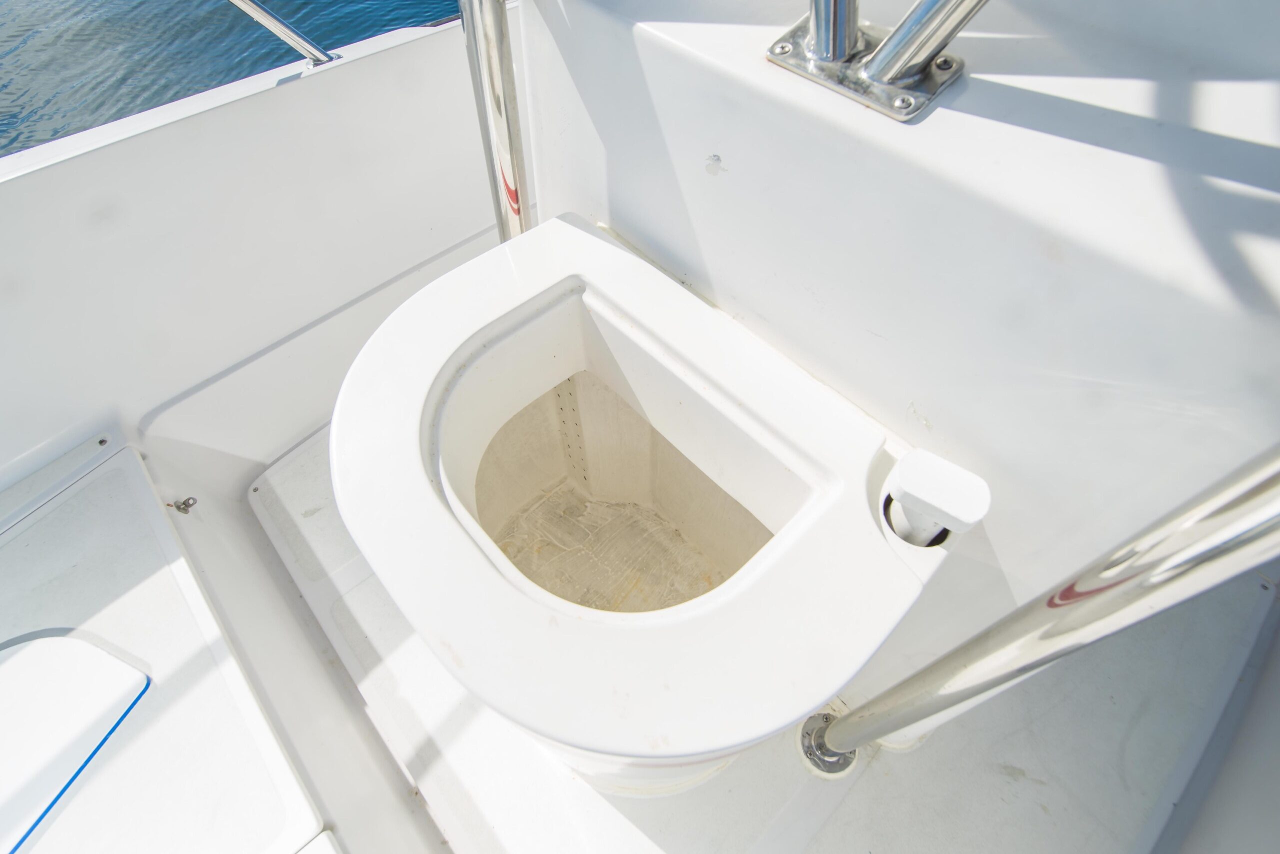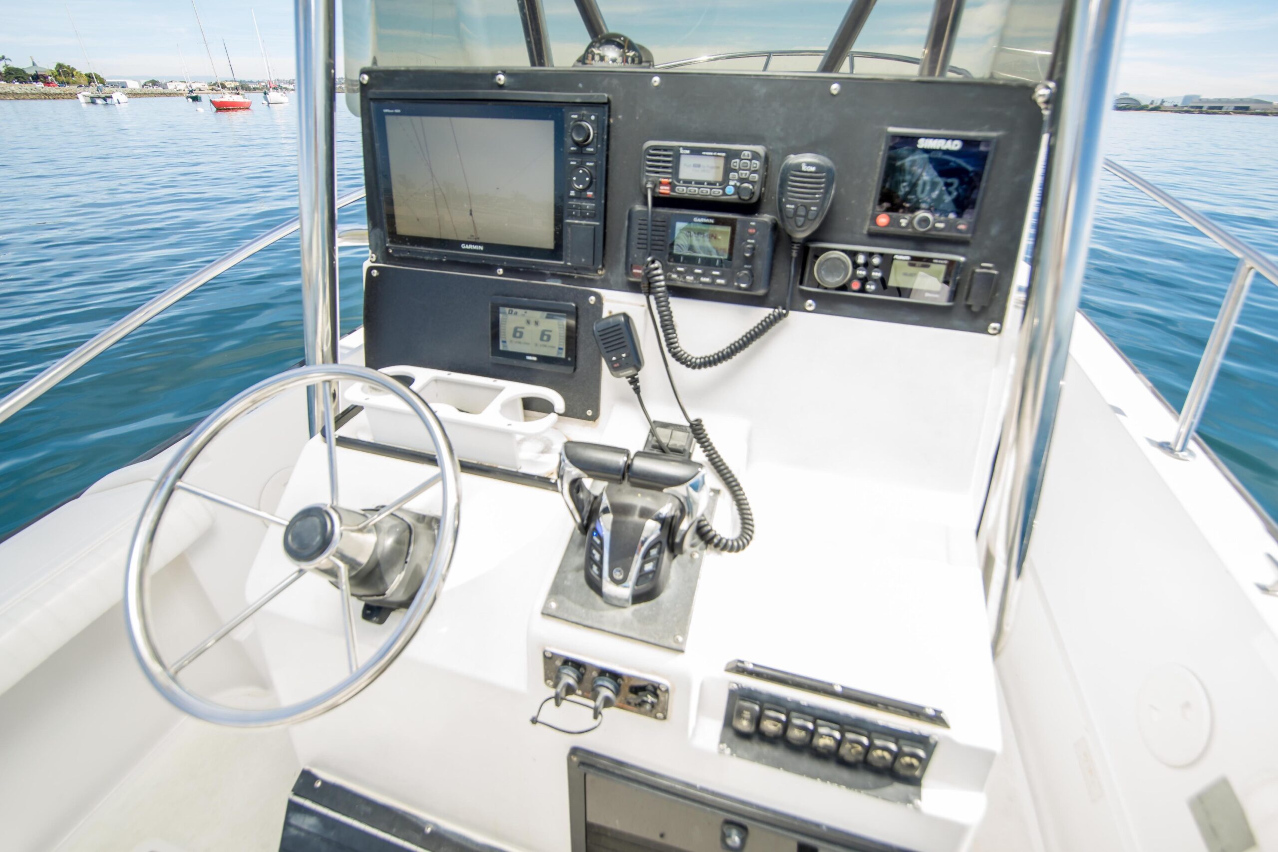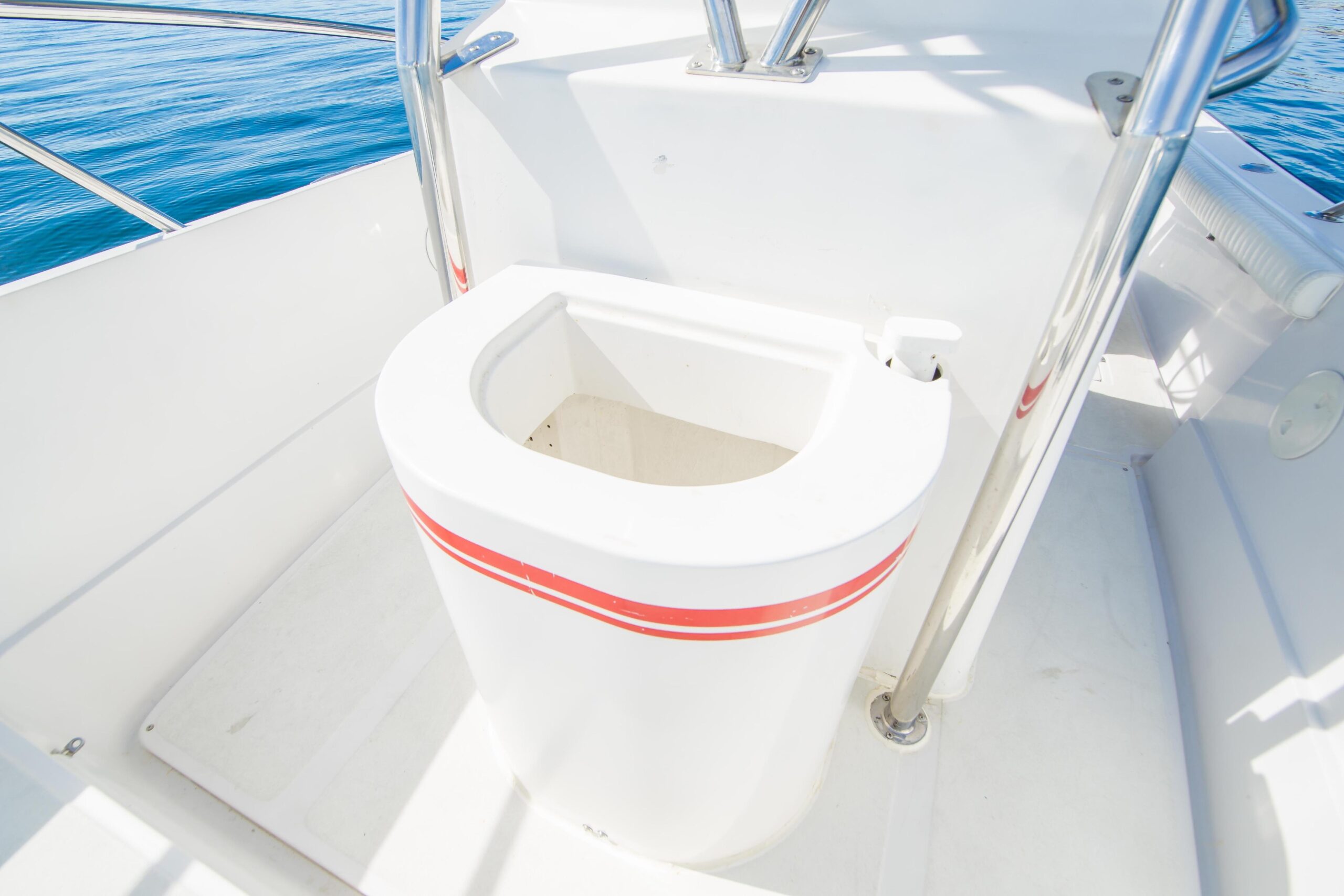 Standard equipment and storage for gear include: rod holders at the gunnels and transom, as well as under-gunnel rod racks, leaning post with backrest, in-deck fish boxes (2), tilt wheel, raw-water washdown, bow casting platform, an enclosed head / storage area with access to batteries and console electronics.