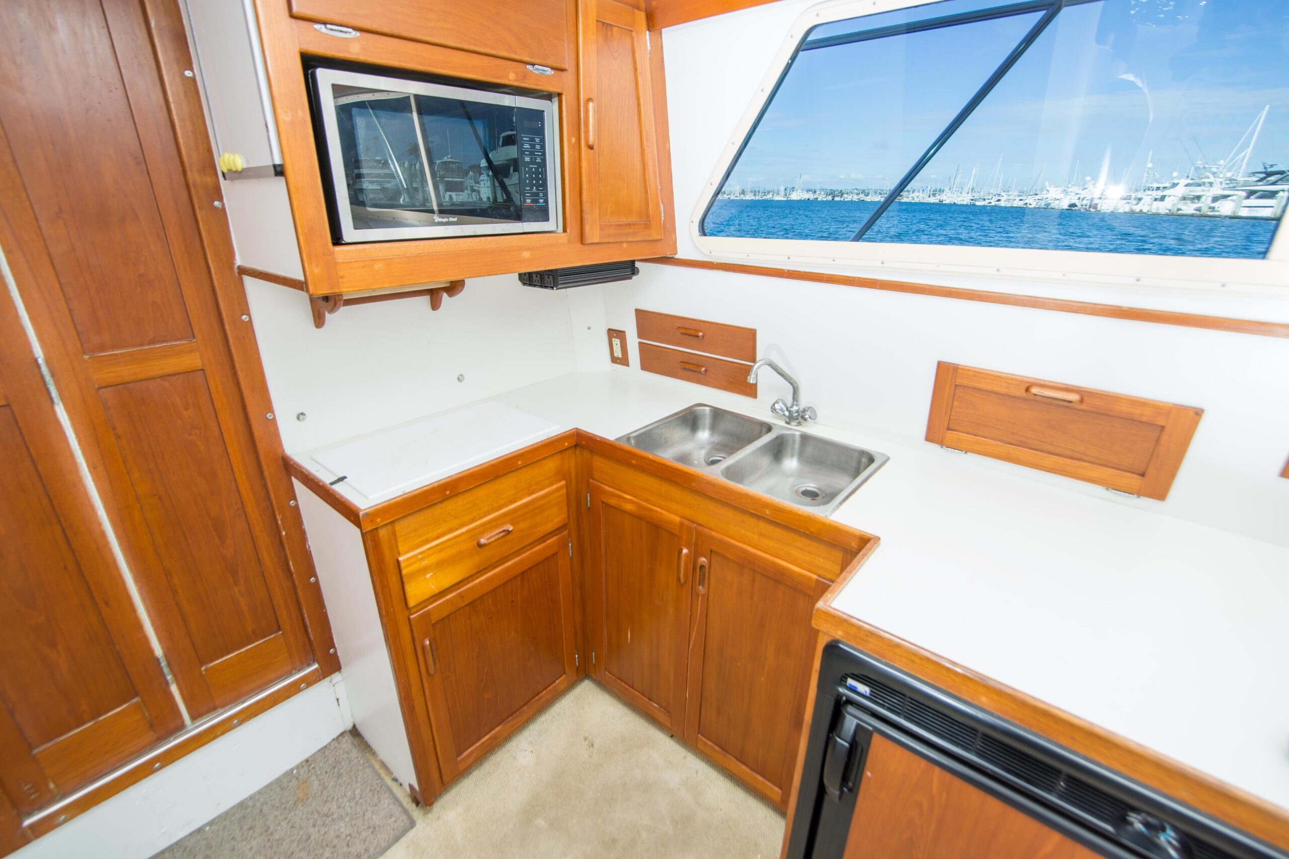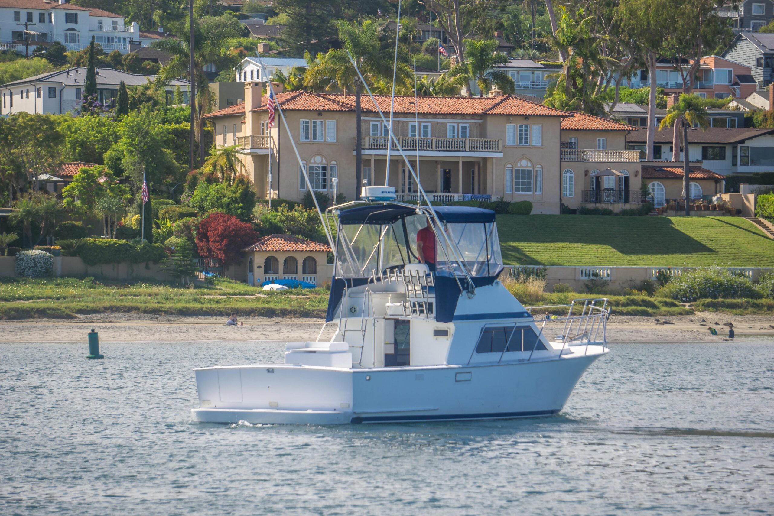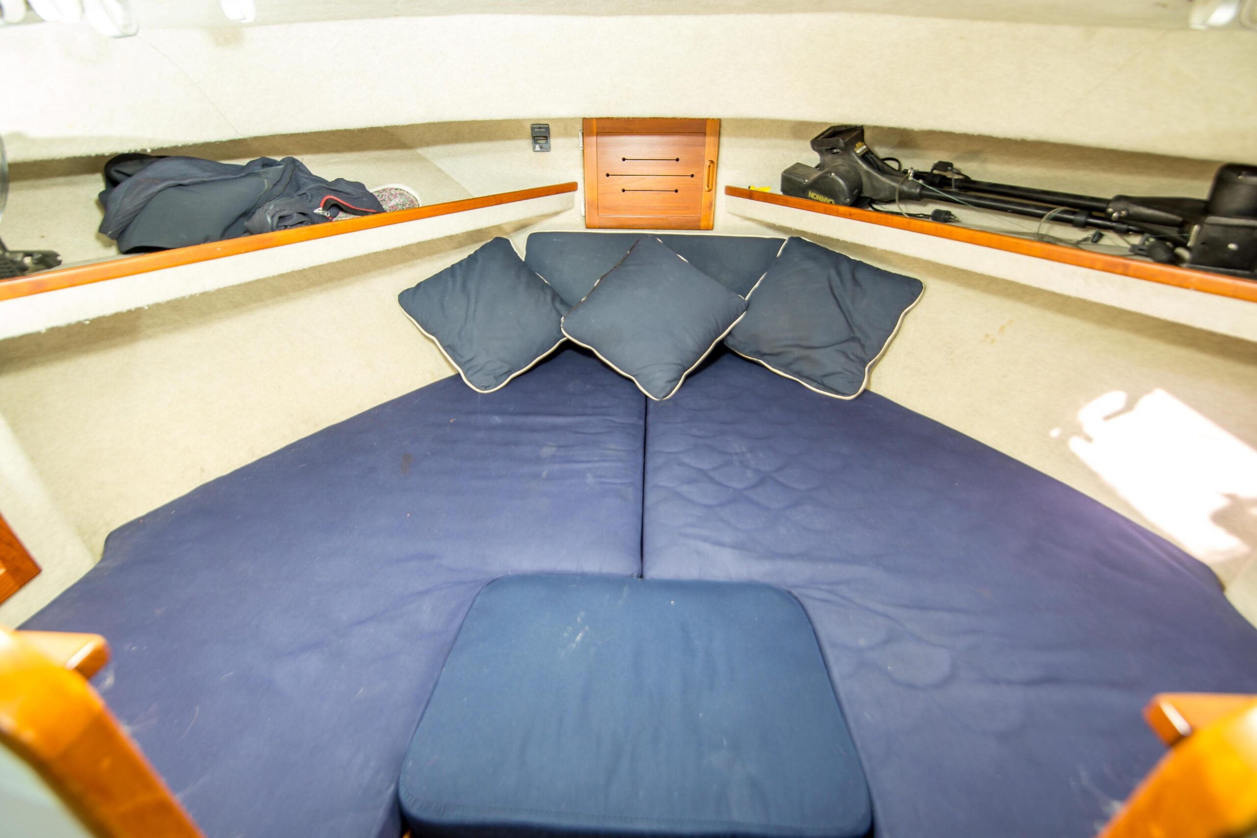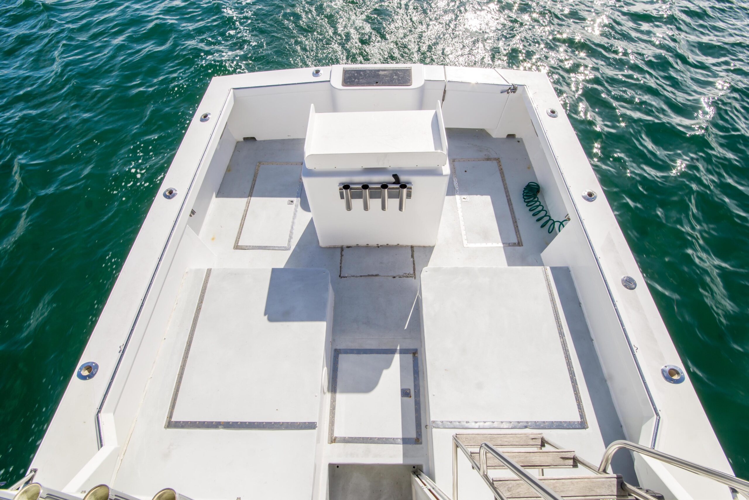 A handsome boat with a flared bow and muscular, low-profile appearance, the Blackfin 32 Sport fisherman began life in the late 1970s as the Maritimer 9.6. Maritimer was later acquired by Blackfin, and the 9.6 then became the Blackfin 32. Designed by well-known naval architect Charlie Jannace, the Blackfin 32 rides on a solid fiberglass deep-V hull, and her wide beam and low freeboard add a degree of stability not always found in a deep-V design. (Indeed, the 32u2019s low center of gravity allows her to carry several people on the flybridge without becoming tender.) The cockpit is large enough for a full-size tuna chair, and engine boxes provide excellent access to the motors. Below decks, the compact, step-down interior of the Blackfin 32u2014tastefully finished with off-white laminates and teak trimu2014 features a convertible dinette to port, U-shaped galley opposite, and a standup head with shower. Topside, the roomy flybridge has bench seating forward of the helm console.u00a0