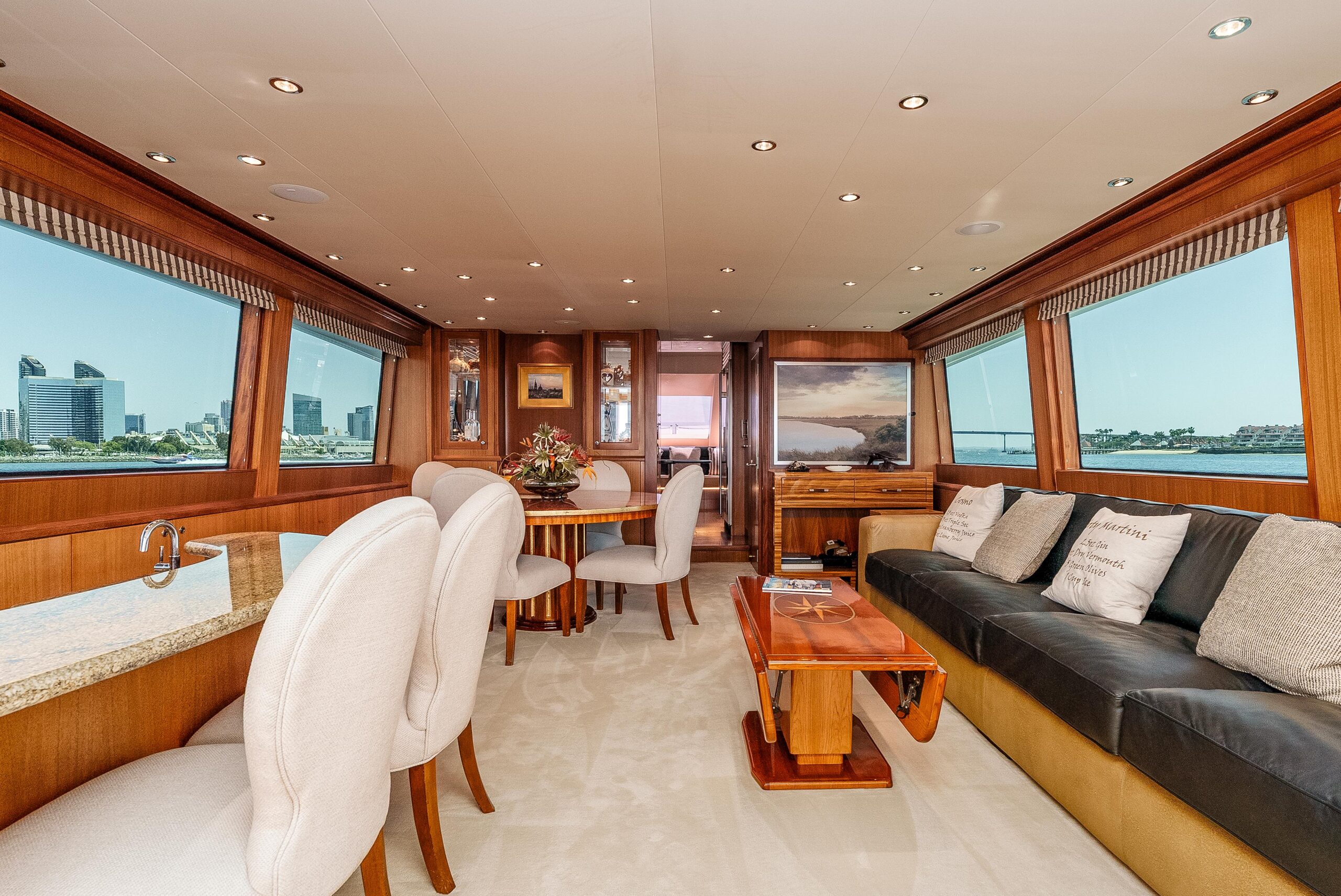 The salon is entered through a stainless steel framed sliding glass door. Flooring on the interior main deck is carpet with 2 custom carpet runners. Immediately to port is a granite top table height tiered wet bar with two bar chairs. Behind the bar the custom black granite tile floor of the bar is sunken twelve inches. Behind the bar outboard are custom storage cabinets for glass and bottle storage. Directly below the bar inboard is additional storage and a Scottsman Ice Machine. A door inside and aft of the bar leads to a stairwell down to the Fifth guest or captain / crew stateroom and the engine room. A TV is mounted above the bar for visibility throughout the salon. On the starboard side of the salon is a swivel barrel chair and full size sofa with ample storage underneath. Forward to starboard is a custom built zebra wood storage cabinet with 2 drawers followed by the day head. Forward on the port side is a custom end grain mahogany round dining table with four chairs, bar chairs can add to the seating for 6.